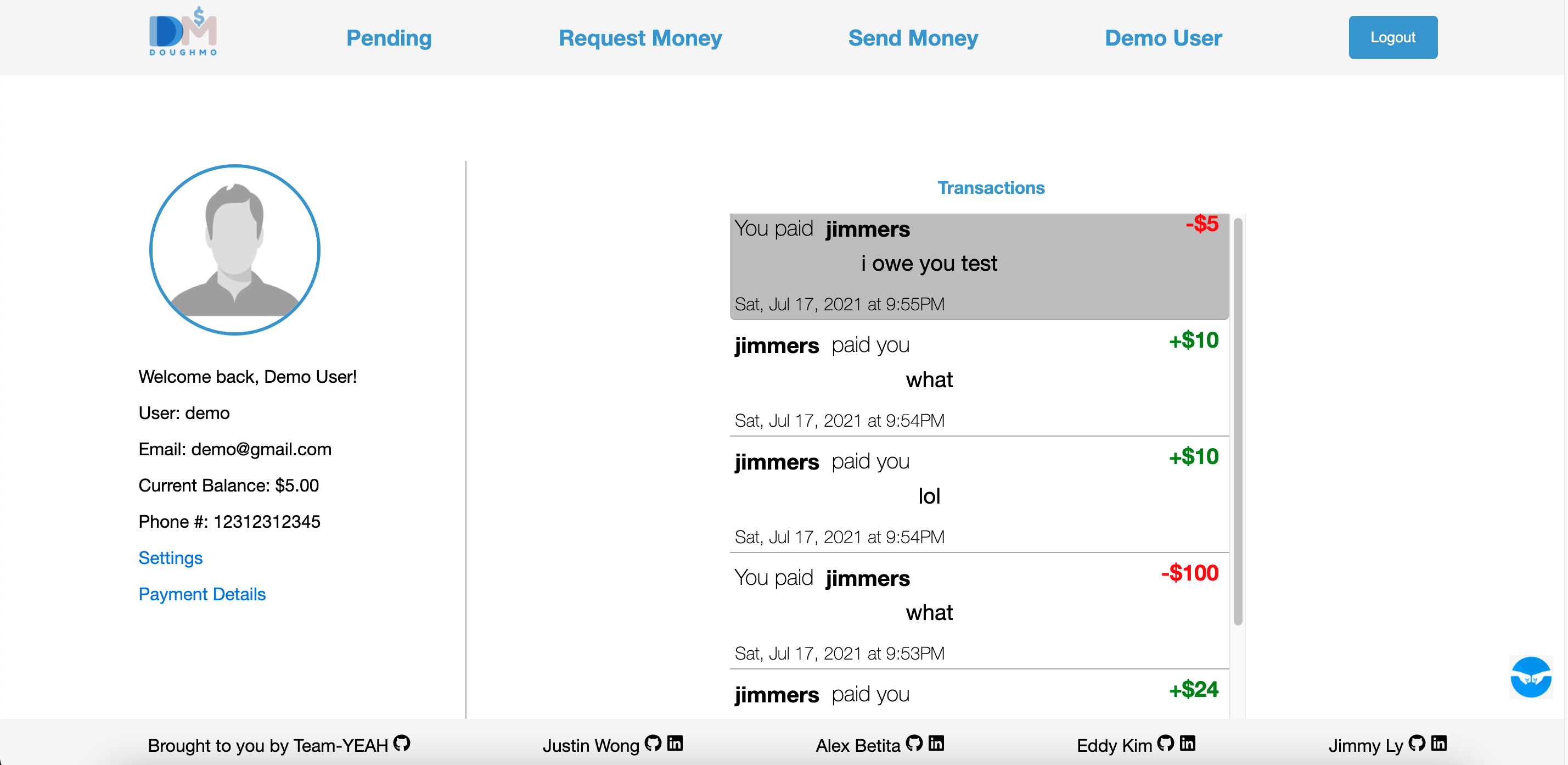 An application inspired by Venmo for peer to peer transactions.